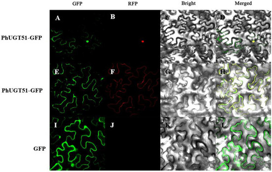The coding regions of PhUGT51 were amplified by polymerase chain reaction (PCR) with primers UGT51-F/UGT51-R and then fused to the pSuper1300-eGFP plant expression vector by homogenous recombination method (Table S2). Subcellular localization was carried out according to the method of Yao et al. [33].