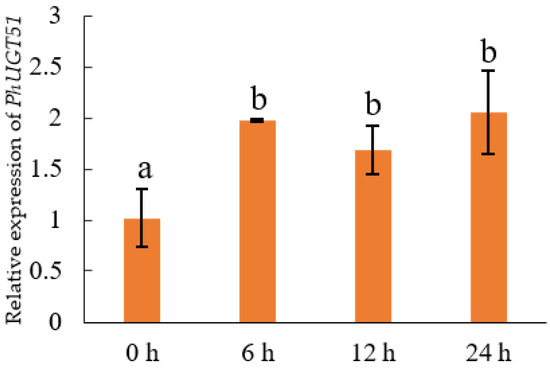 Quantitative real-time PCR (qRT-PCR) analysis of PhUGT51 after various NaCl treatment periods. Lowercase letters indicate significant differences.
