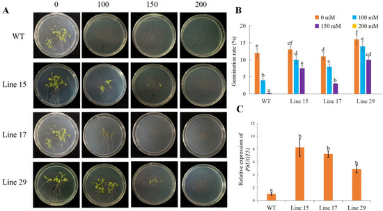To further evaluate whether overexpression of PhUGT51 can improve tolerance against salt stresses, we constructed the 35S::PhUGT51 vector, and transformed it into Petunia. Three representative lines, Line 15, Line 17, and Line 29, were selected using qRT-PCR analysis (Figure 7). The results showed that the expression level of PhUGT51 was upregulated 5–8 times in the overexpressed transgenic plants compared with the control. In the absence of NaCl, the germination rate of transgenic plants and control lines was markedly similar, while in the presence of NaCl, the germination rate was significantly inhibited. When NaCl concentration was 100 mM, the germination rate of control decreased from 12% to 4%, while that of Line 15, Line 17, and Line 29 decreased from 13%, 11%, and 16% to 10%, 8%, and 14%, respectively. When the NaCl concentration increased to 150 mM, the control seeds hardly germinated, while the germination rates of Line 15, Line 17, and Line 29 reached 7.5%, 3%, and 10%, respectively. The above experiments showed that the germination rate of transgenic plants was significantly higher than that of control under high salt concentration, indicating that PhUGT51 could enhance salt tolerance in Petunia.