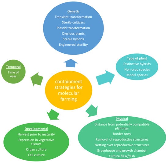 Plant containment can be implemented via several methods, more than one of which can be utilized at a time (Figure 1). These can include physical, genetic, temporal, developmental strategies and more, for reviews see [,,,]. Physical approaches include planting the molecular farming crop a set distance away from potentially compatible plants, implementing border rows of standard plants around the molecular farming crop, removing reproductive structures prior to maturity such as detasseling corn, or growing plants in an enclosed environment such as a greenhouse or growth chamber. Genetic specific containment options include using transient transformation such that any transgenes are not passed on to potential offspring, growing sterile cultivars, using plants with high levels of self-pollination and thus low levels of out-crossing, creating sterile hybrids, using plastid transformation (such that potential flow via pollen is greatly reduced), growing dioecious plants to reduce gene flow potential, or engineering sterility [,] Other options include expression in vegetative tissues such as leaves, allowing for harvest prior to maturity, or by implementing organ culture or cell culture of the plant material. These last two options utilize growth in a chamber, which adds an additional layer of physical containment. Another possibility is to use phenotypically distinct plants for molecular farming, such that the plant (prior to a certain degree of processing) is readily recognizable []. Purple fruited Solanum lycopersicum (tomatoes) were proposed for this purpose and used for antibody production []. However, there are now both conventional and GE purple tomatoes developed for non-molecular farming purposes, so this trait is no longer suitable as an indicator of molecular farming tomatoes []. Some of these approaches will not work well for all molecular farming plants as sometimes the wanted product is the seed, the formation of which generally requires sexual reproduction.