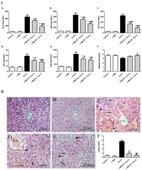 The Con A injection induced notable hepatic damage that was evident through the significant rise in the serum indices of the liver toxicity (ALT, ALP, LDH, AST, and γ-GT) and significant depression in the albumin level compared with the control group (Figure 3I).