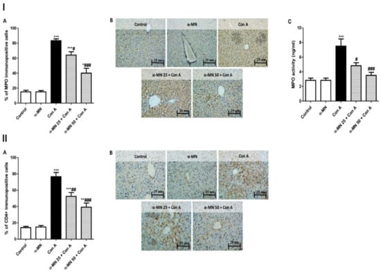 The Con A group exhibited an elevated level and a high MPO immuno-expression compared with normal group (Figure 4I). On the contrary, the α-MN pre-treatment dramatically decreased the MPO level and its immuno-expression compared with the Con A group. Additionally, a Con A injection augmented the CD4+ T cells infiltration into the hepatic tissue compared with the control mice. The α-MN pre-treatment suppressed the CD4+ T cells infiltration in comparison with the Con A group (Figure 4II).