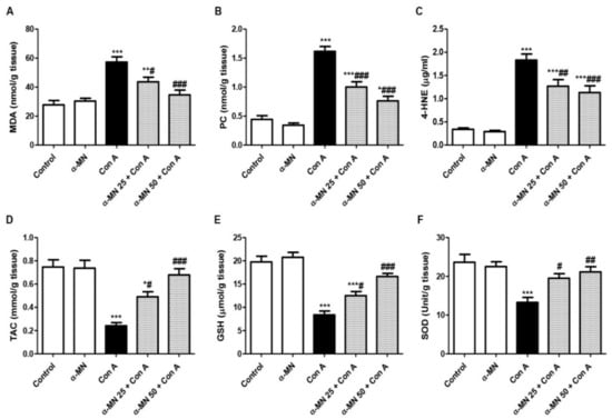 Alpha-mangostin (α-MN) ameliorated concanavalin-A (Con A)-induced oxidative stress and enhanced antioxidants in the hepatic tissue. (A) Malondialdehyde (MDA); (B) Protein carbonyl (PC); (C) 4-Hydroxynonenal (4-HNE); (D) Total antioxidant capacity (TAC); (E) Reduced glutathione (GSH); (F) Superoxide dismutase (SOD). Data are the mean ± SE. (n = 8); *** p < 0.001; ** p < 0.01; * p < 0.05 vs. control group; ### p < 0.001; ## p < 0.01, # p < 0.05 vs. Con A group (one-way ANOVA).