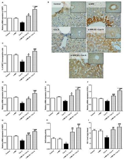 The Con A challenge resulted in a reduced mRNA expression of SIRT1, Nrf2, NQO1, and GCL in comparison with the control group. The immuno-expression of SIRT1 was also depressed in the Con A group compared with normal animals. The Nrf2 binding capacity and HO-1 level were significantly decreased in the Con A group. On the contrary, the α-MN pre-treatment amplified the Nrf2/SIRT1/NQO1/HO-1/GCL signaling and augmented the expression of these genes. Moreover, the Nrf2 binding capacity and HO-1 level were increased in the α-MN pre-treated groups compared with the Con A group (Figure 6).