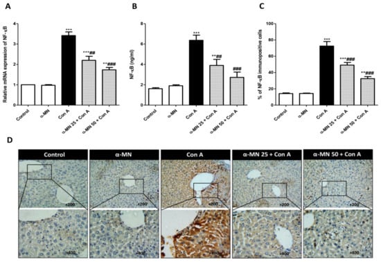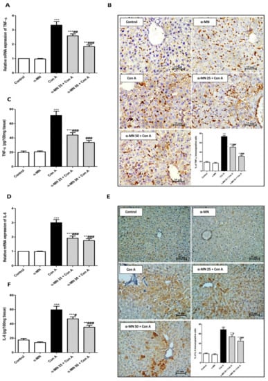 As shown in Figure 7, there was a significant increase in the mRNA expression, the level and immuno-expression of IL-6, NF-κB, and TNF-α in the Con A group in comparison with the control mice. Contrarily, the α-MN pre-treated groups showed significantly decreased NF-κB, TNF-α, and IL-6 levels and expression compared with the Con A group (Figure 7 and Figure 8).