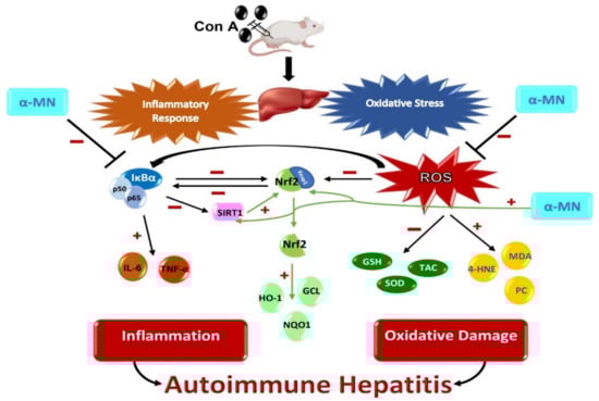 α-MN could prevent Con A-induced AIH through its inhibitory effect on the hepatic oxidative stress and the inflammatory NF-κB/cytokine cascade, as well as the enhancement of the SIRT1/Nrf2 antioxidative signaling pathway (Figure 9). These results suggested a new scope for the use of α-MN in the treatment of AIH. Additional experimental work is mandatory to test the ability of α-MN to reverse the deleterious Con A-induced hepatic fibrosis and explore other mechanistic possibilities. Furthermore, clinical studies are essential to confirm the hepatoprotective efficacy of α-MN in AIH.