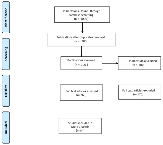 These searches resulted in 700 published and unpublished online references, of which 260 were considered likely to contain significant information. Data were collected from 260 publications. To avoid bias in the selection of published papers, selected data were based on the following criteria: (1) Published (International publications) papers should contain experiments with both control (Without AMF inoculation) and treatment (with AMF inoculation) data; (2) publications should have means, standard deviations (SD), or standard errors (SE) with replication numbers; (3) publications should have the level of drought intensity (percentage of field capacity); (4) a minimum of two extractable observations from each publication; (5) excluded studies with single observations; (6) publications were excluded when the study was based on tolerant or sensitive genotypes; (7) publications were excluded based on polyethylene glycol (PEG) induced drought stress studies; (8) publications were excluded studies containing data other than antioxidant enzymes. Based on our inclusion criteria 176 publications were excluded, and the list was refined to 84 publications (Figure 1, Table S1-Dataset, Table S2).