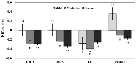 Separate meta-analyses were conducted for the H2O2 for sorting the AMF inoculation and ROS accumulation under drought stress conditions. AMF inoculation significantly reduced the H2O2 concentration in all plants under drought stress (−21%, p < 0.01) compared to those of NM plants. Further, analyzed the importance of the level of drought intensity on H2O2 production in AMF inoculated plants. Results showed that the effect size of H2O2 increased by 1% for mild drought stress intensity when compared to non-inoculated controls but was found to be non-significant. Whereas, for moderate and severe stress the effect sizes decreased significantly by −24% and −25%, respectively (p < 0.01) (Figure 3).