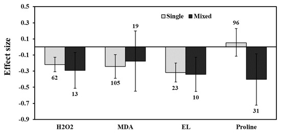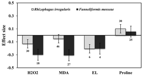 Effect of drought stress on H2O2, MDA, EL, and Proline levels in AMF inoculated plants. Error bars are means ± 95% confidence intervals (CIs). Where the CIs do not overlap the horizontal lines, the effect size for a response variable is significant at p < 0.05. The numbers of observations are shown above the bar. Note: H2O2–Hydrogen peroxide, MDA–Malondialdehyde, EL–Electrolyte leakage.