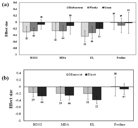 Categorical analysis of plant functional groups (a) and taxonomic groups (b) on H2O2, MDA, EL, and Proline levels. Error bars are means ± 95% confidence intervals (CIs). Where the CIs do not overlap the horizontal lines, the effect size for a response variable is significant at p < 0.05. The numbers of observations are shown above the bar. Note: H2O2–Hydrogen peroxide, MDA–Malondialdehyde, EL–Electrolyte leakage.
