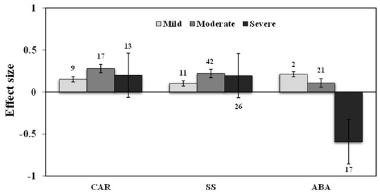 Across all observations, AMF inoculation showed decreased ABA level by 16% under drought stress, but non-significant (n = 40; E++ = −0.18; 95 % CI, −0.45 to 0.09), where 95% CIs slightly overlapped with zero (Figure 2). Drought intensity levels showed that the effect sizes of ABA increased by 24% and 11%, respectively, for mild stress and moderate drought stress intensity. Whereas, the effect sizes of severe stress decreased by 45% under drought stress (Figure 7).