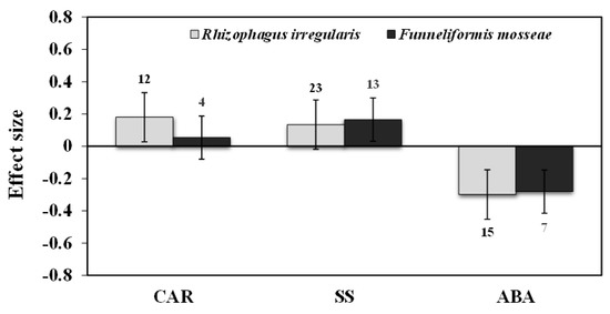 Categorical analysis of AMF species on CAR, SS, and ABA levels. Error bars are means ±95% confidence intervals (CIs). Where the CIs do not overlap the horizontal lines, the effect size for a response variable is significant at p < 0.05. The numbers of observations are shown above the bar. Note: CAR–Carotenoids, SS–Soluble sugars, ABA–Abscisic acid.
