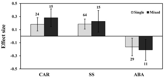 Categorical analysis of AMF inoculation type on CAR, SS, and ABA levels. Error bars are means ± 95% confidence intervals (CIs). Where the CIs do not overlap the horizontal lines, the effect size for a response variable is significant at p < 0.05. The numbers of observations are shown above the bar. Note: CAR–Carotenoids, SS–Soluble sugars, ABA–Abscisic acid.