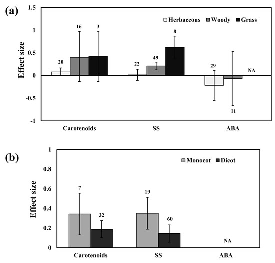 Categorical analysis of plant functional groups (a) and taxonomical groups (b) on CAR, SS, and ABA levels. Error bars are means ± 95% confidence intervals (CIs). Where the CIs do not overlap the horizontal lines, the effect size for a response variable is significant at p < 0.05. The numbers of observations are shown above the bar. Note: CAR–Carotenoids, SS–Soluble sugars, ABA–Abscisic acid.