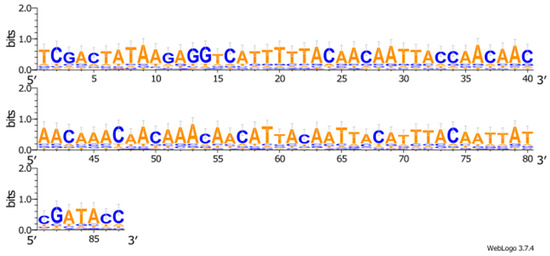 The performed theoretical studies allowed us to determine the 5′UTR sequence potentially able to guarantee a highly efficient translation of the target gene transcript in plant systems (Figure 1). This sequence has a size of 87 bp and GC content of 35.6%.