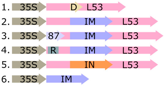 Scheme of the target part of T-DNA expression vectors pFGG-L53 (1), pVIG-T-L53-IN (2), pVIG-T-L53-IN-M (3), pVIG-T-87-L53-IN-M (4), pVIG-T-Arg-L53-IN-M (5), and pVIG-T-IN-M (6); 35S—35S RNA CaMV promoter; L53—sequence of thermostable lichenase reporter gene; D—cloning area of target inserts using GoldenGate technology; IM—modified interferon-αA gene (IFNαA-M); 87—consensus 5′UTR deduced based on theoretical predictions (87 bp); R—Arg, a destabilizing amino acid (as the second amino acid residue in the thermostable lichenase N-terminal region); IN— native interferon-αA gene (IFNαA).