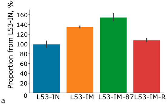 Comparative analysis of the activity of thermostable lichenase (a) and biological activity of interferon-αA (b) as parts of a recombinant protein using different expression vectors for transient expression. L53-IN—transient expression using the vector pVIG-T-L53-IN to carry out the sequence of the native interferon-αA gene (IFNαA) integrated in the loop region of the gene coding for thermostable lichenase; L53-IM—transient expression using the vector pVIG-T-L53-IN-M to carry out the sequence of the modified interferon-αA gene (IFNαA-M) integrated in the loop region of the gene coding for thermostable lichenase; L53-IM-87—transient expression using the pVIG-T-87-L53-IN-M to carry out the consensus 5′UTR deduced based on theoretical predictions (87 bp) integrated between the CaMV 35S RNA promoter sequence and the transcription start codon (ATG) of the hybrid IFNαA-M gene; L53-IM-R—transient expression using vector pVIG-T-Arg-L53-IN-M to carry out the sequence of the modified interferon-αA gene (IFNαA-M) integrated in the loop region of the gene coding for thermostable lichenase in which the triplet coding for Gly, a stabilizing amino acid, was replaced with Arg, a destabilizing amino acid (as the second amino acid residue in the thermostable lichenase N-terminal region).