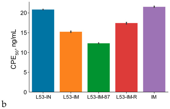 The activities of native (IN-M) and hybrid (L53-IN-M) interferons and thermostable lichenase (LicB-53; control) were determined according to the inhibition of the cytopathic effect of a test virus (vesicular stomatitis virus, VSV, strain Indiana at a dose of 100 CPE50) in the L929 continuous cell culture grown in 96-well Linbro culture plates. The value inverse to the dilution of the sample providing a 50% cell protection from the CPE of the test virus was regarded as the titer of the protein. Briefly, the L929 cells (Merck KGaA, Darmstadt, Germany) were diluted with the medium supplemented with 10% fetal bovine serum (FBS) to 2.5 × 105–3.5 × 105 cells/mL. Each well of a 96-well plate was inoculated with diluted cells (100 µL). Samples of plant protein lysates diluted with the medium containing 10% FBS to the necessary concentrations according to the total soluble protein (0.95, 1.9, 3.81, 7.62, 15.25, and 30.5 ng/mL) were incubated with L929 cells for 16–18 h at 37 °C. The medium was then replaced with DMEM containing 7% FBS and 100 CPE50 VSV. After 24 h of incubation, cell viability was assessed using an MTT assay [40]. Optical density (OD) was measured in a PHERAstar FSX (BMG Labtech, Ortenberg, Germany) multimodal reader. The amount of total soluble protein obtained from the plant material and required for 50% cell protection from the test virus CPE was used to assess the accumulation level of the native (IN-M) and hybrid (L53-IN-M) interferons in the plant system. The experiments were performed in triplicate. Note that the CPE50 values reported by different laboratories may differ because of different experimental conditions [16].