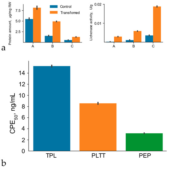 Total soluble protein (1) and lichenase activity (2) of plant protein lysates before (A) and after incubation at 65 °C (B) and subsequent ethanol denaturation (C) (a). Control—control N. benthamiana plants (without agroinfiltration); Transformed—N. benthamiana plants after agroinfiltration using the vector pVIG-T-L53-IN-M; µg/mg RW—the amount of total soluble protein in terms of 1 μg of fresh weight of plant tissue. Biological activity of interferon-αA (b). TPL—total protein lysate after transient expression using the vector pVIG-T-L53-IN-M; PLTT—the protein lysates after temperature treatment; PEP—the protein lysate after temperature treatment and ethanol precipitation. Samples balanced for the amount of total soluble protein are applied.