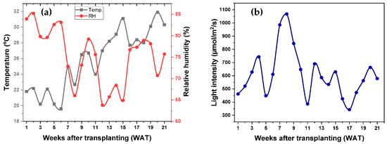 Agrometeorological data (a) average weekly temperature and relative humidity, and (b) light intensity recorded throughout the growing period.