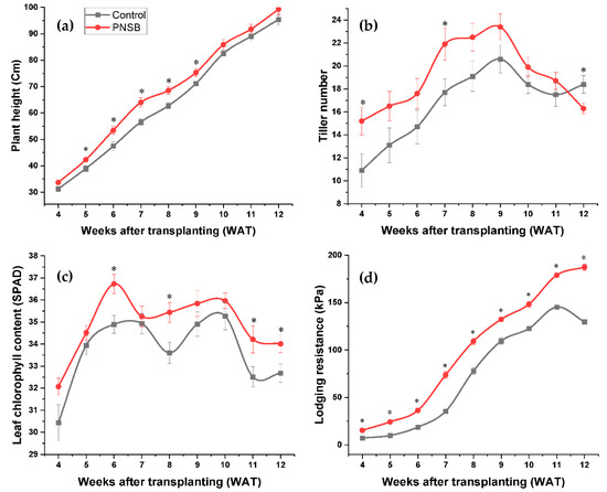 Agronomic performances (a) average plant height, (b) average tiller number, (c) average leaf chlorophyll content, and (d) average lodging resistance of rice crop under PNSB-treated and untreated plants. * denotes significant differences between control and treated plants in the respective weeks; bars represent standard error.