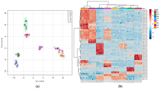 UHPLC-MS fingerprints of leaf methanolic extracts of Aegiceras corniculatum (red), Avicennia marina (green), Lumnitzera racemosa (pink), Bruguiera gymnorhiza (dark blue), Kandelia obovata (light blue), Rhizophora stylosa (yellow), Sonneratia apetala (purple) and S. caseolaris (orange): (a) principal component analysis where each sample is represented by a dot; (b) hierarchical clustering heatmap of most significant m/z features amongst species groups (ANOVA, p < 0.05). Each colored cell corresponds to a normalized, log10-transformed and mean-centered abundance value. Samples are in rows and m/z features in columns.