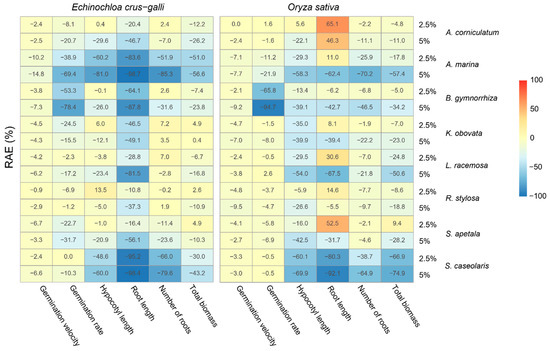 Heatmap representing Relative Allelopathic Effect (RAE) indices of 8 mangrove species’ (Aegiceras corniculatum, Avicennia marina, Bruguiera gymnorhiza, Kandelia obovata, Lumnitzera racemosa, Rhizophora stylosa, Sonneratia apetala and Sonneratia caseolaris) leaf aqueous extracts on germination (rate and velocity) and growth parameters (hypocotyl length, root length, number of roots and total biomass) of Echinochloa crus-galli and Oryza sativa seedlings 10 days after germination. The extracts were prepared at 2.5% and 5%.