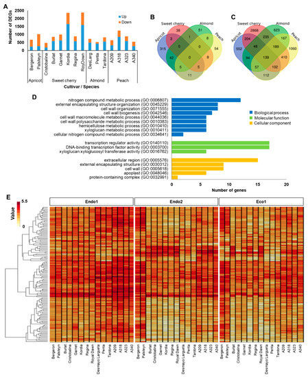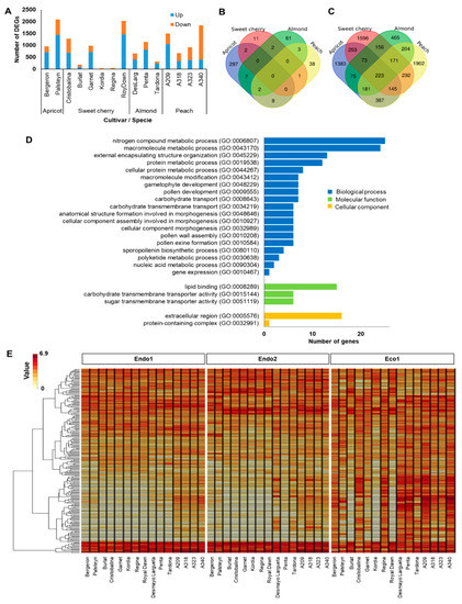 Summary of ecodormancy-related genes. (A) Number of differentially expressed genes (DEGs) in each cultivar. (B) Venn diagram of common DEGs in all apricot, almond, peach, and sweet cherry cultivars. (C) Venn diagram of common DEGs in at least one cultivar of each species. (D) Enrichments in gene ontology terms for biological process, molecular function, and cellular component of common DEGs in at least one cultivar of each species. (E) Heatmap of the 223 common DEGs in at least one cultivar of each species during dormancy.