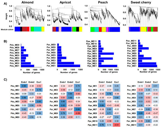 Co-expression networks constructed in almond, apricot, peach, and sweet cherry. (A) Dendrograms of gene clustering based on RNAseq data. (B) Number of genes in each module. (C) Correlation (p−values) between modules and dormancy stages (red and blue colorations indicate a negative and positive correlation, respectively).