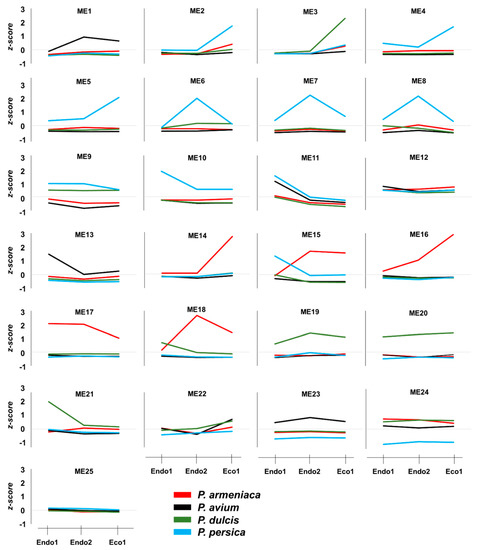 Weighted gene co-expression network analysis was performed using WGCNA v.1.70-3 package implemented in R [115]. Co-expression networks were independently constructed for cultivars of each species (almond, apricot, peach, and sweet cherry) and combined for all Prunus cultivars. Only DEGs during dormancy were included for network construction, considering a minimum module size of 10 and a merge cut height value of 0.25 as parameters. The first principal component of the expression matrix of the corresponding modules was used to define module eigengene (ME), and Pearson’s correlation coefficient at the significant level of p < 0.05 was used to determine correlations between modules and dormancy stages (Endo1, Endo2, and Eco1), where modules were denoted by their ME and dormancy stage by a numeric vector (‘1′ for the considered stage and ‘0′ for the others).