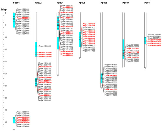 Mapping of candidate genes within major bloom time, chilling, and heat requirements QTLs on Prunus species [8,10,11,18,19,20,21,22,54,55,56]. Only differentially expressed genes during dormancy were considered for mapping in these QTL intervals. Genes highlighted in red show annotations related to dormancy control. Gene names were obtained from peach genome v2.0.a1 [57]. The scale represents the chromosomal position in megabase pair (Mbp).