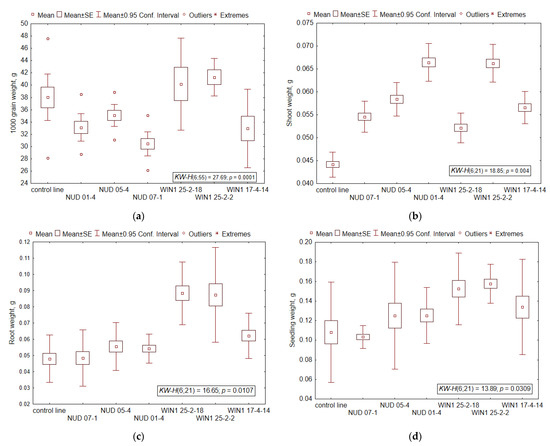 Variation of air-dried weights of grains and seedlings of nud KO and win1 KO barley lines: (a) grains (number of samples for each line, N = 4–10), (b) shoots (N = 3), (c) roots (N = 3), and (d) seedlings (N = 3). The mean values, standard error (SE) and 95% confidence interval are indicated in the Figure 1. The nonparametric Kruskal-Wallis (KW) method was used, where H is the criterion value, p-value is the significance level. The degree of freedom (df) values of the numerator and denominator of H-criterion are given in brackets.