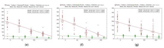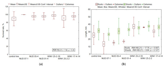 In growth characteristics (Figure 2b), for example shoot length, the lines do not differ significantly from each other (H6;21 = 9.94; p = 0.127). This parameter positively correlated with the number of roots (R = 0.49–0.58; p = 0.0065–0.039), root length (R = 0.70–0.86; p = 0.0001–0.0381), shoot weight (R = 0.62; p = 0.0025), and root weight (R = 0.61; p = 0.0034).