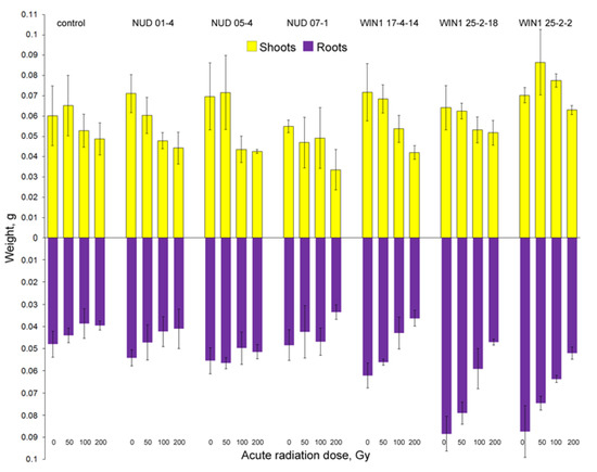 Overall, γ-irradiation had a significant impact on the most sensitive processes: cell division (thereby leading to a decrease in the weight of seedlings), the number of seedlings with leaves, and shoot and root lengths; there was no influence on seed germination, seedling survival, and the root number. Radioresistance—as estimated with the help of sensitive indicators—differed among the analyzed lines. In terms of the number of seedlings with leaves, the WT line was the most resistant to irradiation. At the same time, judging from the weights of roots and seedlings, the radioresistance of nud KO lines and WT plants was higher than that of win1 KO lines. Nud KO lines were also found to be radioresistant in terms of root length and the shoot-to-root length ratio.