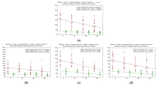 The average shoot length (mm) and the total root length (mm) in seedlings of barley KO lines after irradiation. (a) WT, (b) nud 07-1, (c) nud 05-4, (d) nud 01-4, (e) win1 25-2-18, (f) win1 25-2-2, and (g) win1 17-4-14. The x-axis denotes radiation doses (Gy). The number of samples for each dose or line was N = 41–48 (shoots) and N = 43–48 (roots). The mean, standard error (SE) and 95% confidential interval are indicated in the Figure 5. The nonparametric Kruskal-Wallis (KW) method was used, where H is the criterion value, p-value is the significance level. The degree of freedom (df) values of the numerator and denominator of H-criterion are given in brackets.