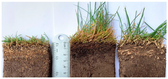Turfgrass thatch development (approximately 2–3 cm as shown) in different turfgrass systems: creeping bentgrass (Agrostis stolonifera) maintained at a golf course fairway height (left), fine fescue (Festuca sp.) maintained as a lawn (middle), and tall fescue (F. arundinacea) maintained as a lawn (right).