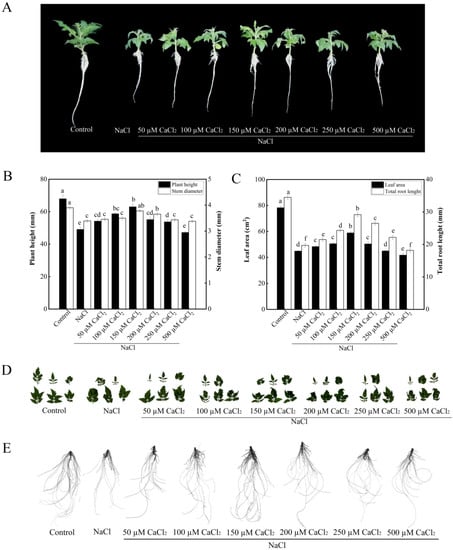 Effects of various concentrations of CaCl2 on the growth of tomato seedlings under salt stress. (A): Plant phenotype; (B): plant height and stem diameter; (C): plant leaf area and total root length; (D): leaf phenotype; (E): root phenotype. The values (means ± SE) are the averages of three independent experiments (n = 15). The columns labeled with different small letters indicate significant differences between treatments by Tukey’s multiple comparison test (p < 0.05).