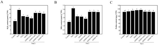 The content of H2O2, MDA, and proline in tomato seedlings under salt stress. (A): H2O2 content; (B): MDA content; (C): proline content. The values (means ± SE) are the averages of three independent experiments (n = 15). The columns labeled with different small letters indicate significant differences between treatments by Tukey’s multiple comparison test (p < 0.05).