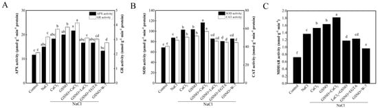 Effects of exogenous NO and Ca2+/CaM on antioxidant enzyme activity of tomato seedlings under salt stress. (A): APX and GR activities; (B): SOD and CAT activities; (C): MDHAR activity. The values (means ± SE) are the averages of three independent experiments (n = 15). The columns labeled with different small letters indicate significant differences between treatments by Tukey’s multiple comparison test (p < 0.05).