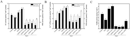 Effects of NO on downstream target enzymes related by Ca2+/CaM in tomato seedlings under salt stress. (A): GC and PDE activities; (B): Ca2+-ATPase and PLD activities; (C): NADK activity. The values (means ± SE) are the averages of three independent experiments (n = 15). The columns labeled with different small letters indicate significant differences between treatments by Tukey’s multiple comparison test (p < 0.05).