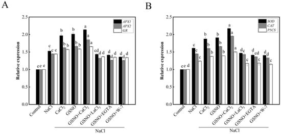 There are several reports demonstrated that NO or Ca2+ could regulate the antioxidant system by increasing the activities of antioxidant enzymes to resist damage of abiotic stresses [39]. In the present study, GSNO, CaCl2 or GSNO+CaCl2 treatment significantly increased the activities of antioxidant enzymes such as APX, SOD, CAT, GR, and DHAR under salt stress (Figure 4), which was consistent with the previous study [40]. In addition, a previous study in tall fescue showed that the effect of GSNO was gradually weakened when the EGTA, LaCl3 or PTIO was applied [41]. The result in our study also suggested that LaCl3, EGTA or W-7 would decrease GSNO-increased antioxidant enzyme activity under salt stress. These results are in agreement with the hypothesis that Ca2+ and NO as signaling molecules enhanced seedlings salt stress resistance by increasing antioxidant enzyme activity [38]; additionally, increasing the expression of genes related to antioxidative enzymes such as APX1, APX2, GR, SOD, and CAT, as well as proline synthase-associated gene P5CS (Figure 6). Therefore, Ca2+ and NO alleviated the damage of salt stress by increasing the activity of antioxidant enzymes and the expression of genes related to antioxidative enzymes.