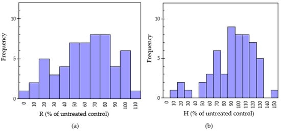Normal distribution of radicle elongation (a) and hypocotyl elongation (b) of lettuce on 55 pharmaceutical plants treated by 10 mg sample using the sandwich method. R: Radicle and H: Hypocotyl.