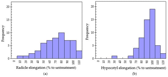 In this experiment, the sandwich method was used to evaluate the allelopathic activity of plant extracts among Chinese pharmaceutical plants. This method was adopted from Fujii [43] and can measure a large number of samples efficiently in a short time. Agar medium (0.70%, w/v, autoclaved for 15 min at 115 °C) was used as the growth medium and lettuce was purchased as the plant receptor at the bio-assay, as their germination is very uniform and sensitive to allelochemicals [44]. To start with, 10 mg of plant samples were put into the multi-dish with 6 wells. For the next step, 10 mL agar (Nakalai Tesque Co., Ltd., Kyoto, Japan, Tokyo) was injected into the wells containing the plant samples. Last, 5 lettuce seeds (Lactuca sativa L., Takii Seed Co., Ltd., Japan, Tokyo) were carefully placed and the multi-dishes were wrapped in silver paper in dark conditions at 23 °C. After 3 days, the radicle and hypocotyl elongation of lettuce was determined. The plant growth elongation rate was calculated by measuring the radicle length of the sample, as shown in Equation (1). Agar with no addition of samples was set as control of untreated control. Data of treatment or untreated were described as the mean of the three replicates.