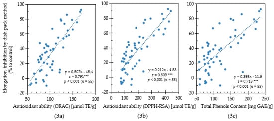 Correlation among ORAC antioxidant ability (3a), DPPH-RSA antioxidant ability (3b), total phenols content (3c) and lettuce elongation inhibition using the sandwich method for Chinese pharmaceutical plants. [***] indicates significant correlation when 0.5 ≤ |r| < 1.