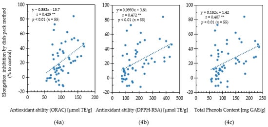 Correlation among ORAC antioxidant ability (4a), DPPH-RSA antioxidant ability (4b), total phenols content (4c) and lettuce elongation inhibition using the dishpack method for Chinese pharmaceutical plants. [**] indicates weak correlation when 0.3 ≤ |r| < 0.5.