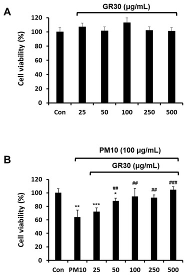 Rat basophilic leukaemia RBL-2H3 cells obtained from the Korean Cell Line Bank (Seoul, Korea) were grown in minimum essential medium (MEM) supplemented with 1% penicillin-streptomycin and 10% FBS at 37 °C in a humidified incubator (5% CO2, 95% air). The cells (1 × 105 cells/well) plated on 12-well microplates were pretreated with GR30 (25~500 μg/mL) for 2 h and then incubated with PM10 for 48 h. Cell viability was measured using the trypan blue exclusion method [42]. After the growth, both adherent and suspended cells were collected, mixed with 0.4% trypan blue buffer, transferred to the haemocytometer and then observed under a microscope (CK40-F200; Olympus, Kyoto, Japan). Blue-stained cells were counted as dead cells. The viable cells were unstained, while dead cells were stained blue.
