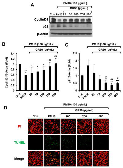Effects of PM10 and GR30 on cell cycle arrest and DNA fragmentation. (A) Cells were pretreated with GR30 (25–500 μg/mL) for 2 h and then incubated with PM10 for 48 h. Cell lysates were analysed by Western blot analysis for p21 and cyclinD1. β-Actin was used as a loading control. (B,C) Protein levels of (B) cyclinD1 and (C) p21 were quantified by densitometric analysis. The data are expressed as the fold normalized to the untreated control (Con). Each value was presented as the means ± SD (n = 3). *, p < 0.05; **, p < 0.01; ***, p < 0.001, compared to the untreated control cells (Con). #, p < 0.05; ##, p < 0.01, compared to the PM10-treated cells (PM10). (D) DNA fragmentation was assessed by TUNEL staining (green) and counterstaining with PI (red). The stained cells were mounted with a mounting solution and visualized using fluorescence microscopy (X400).