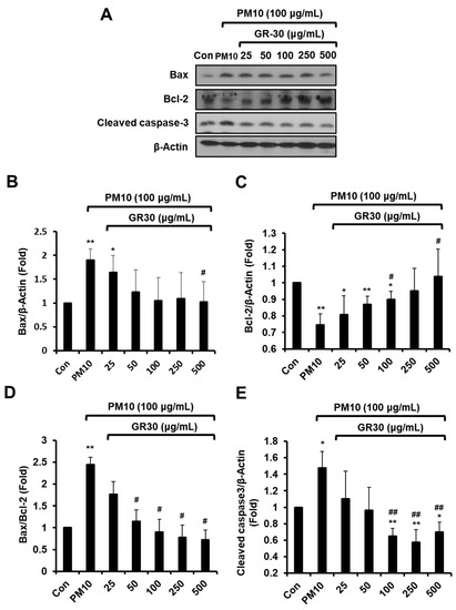 To determine whether PM10 induces mitochondria-dependent apoptosis, cells were incubated with GR30 (25–500 μg/mL) for 2 h and then treated with PM10 for 48 h and Western blot analysis was performed (Figure 3A). The PM10 treatment significantly increased the expression of Bax up to 1.9 fold (Figure 3B) and cleaved caspase-3 up to 1.48 fold (Figure 3E), while that of Bcl-2 decreased up to 0.74 fold (Figure 3C), compared to the untreated control (Con, 1 fold). However, pretreatment with GR30 markedly reversed the PM10-induced elevated levels of Bax expression to 1.02 fold (Figure 3B) and cleaved caspase-3 to 0.7 fold (Figure 3E), compared to the PM10-untreated normal control cells (Con, 1 fold), at 500 μg/mL. Moreover, GR30 restored the Bcl-2 expression level, which was downregulated by PM10 treatment (Figure 3C). PM10 treatment remarkably increased the ratio up to 2.45 fold compared to untreated normal cells (Con, 1 fold), but GR30 significantly and dose-dependently reduced the PM10-induced upregulated level of this ratio (Figure 3D). These results clearly demonstrated that PM10 induces apoptotic death of basophil cells through activation of mitochondria-dependent apoptosis pathway in RBL-2H3 cells and that GR30 protects basophil cells from the toxic effects of PM10 by attenuating the mitochondria-dependent apoptotic pathway activation triggered by PM10 exposure.