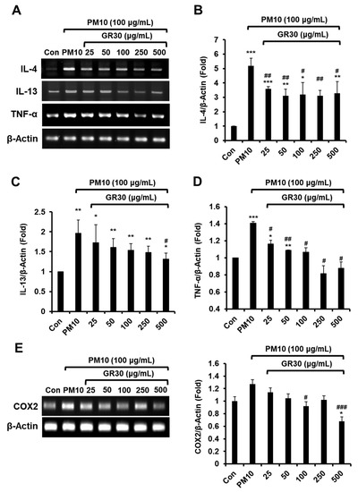 GR30 suppresses PM10-induced IL-4, IL-13, TNF-α cytokine and COX2 expression in RBL-2H3 cells. (A) Cells were pretreated with GR30 (25–500 μg/mL) for 2 h and then incubated with PM10 for 48 h. (B) IL-4, (C) IL-13, (D) TNF-α, and (E) COX2 mRNA levels were evaluated by RT-PCR and expressed as the ratio of the densitometric measurement of mRNA to the internal standard β-actin. Each value was presented as the means ± SD (n = 3). *, p < 0.05; **, p < 0.01; ***, p < 0.001, compared to the control cells (Con). #, p < 0.05; ##, p < 0.01; ###, p < 0.001, compared to the PM10-treated cells (PM10).