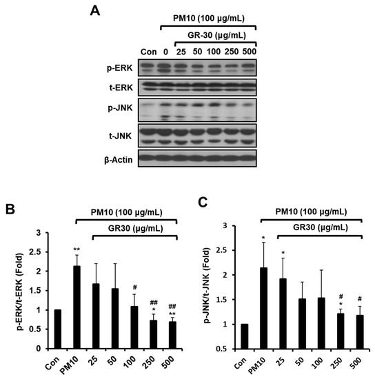 To determine whether PM10 and GR30 could alter the MAPKs pathway activation, their effects on the phosphorylation levels of MAPKs (ERK and JNK) were examined (Figure 5). The cells were incubated with GR30 (25–500 μg/mL) for 2 h and treated with PM10 for 48 h, and the phosphorylation levels of ERK and JNK were determined by Western blot analysis (Figure 5A). While PM10 treatment did not affect the total protein levels of ERK and JNK, it markedly enhanced the phosphorylation levels of ERK (Figure 5B) and JNK (Figure 5C) up to approximately 2.13 and 2.14 fold, respectively, compared to the PM10-untreated control group (Con, 1 fold). However, GR30 pretreatment prior to PM10 exposure, the phosphorylation of ERK and JNK was inhibited up to 0.69 (Figure 5B) and 1.18 fold (Figure 5C) at 500 μg/mL, respectively, compared to PM10-only-treated cells. These results implied that PM10 induces inflammation through activation of MAPK pathway and that GR30 exerts anti-inflammatory effects against PM10-induced inflammation through suppression of MAPK pathway activation.